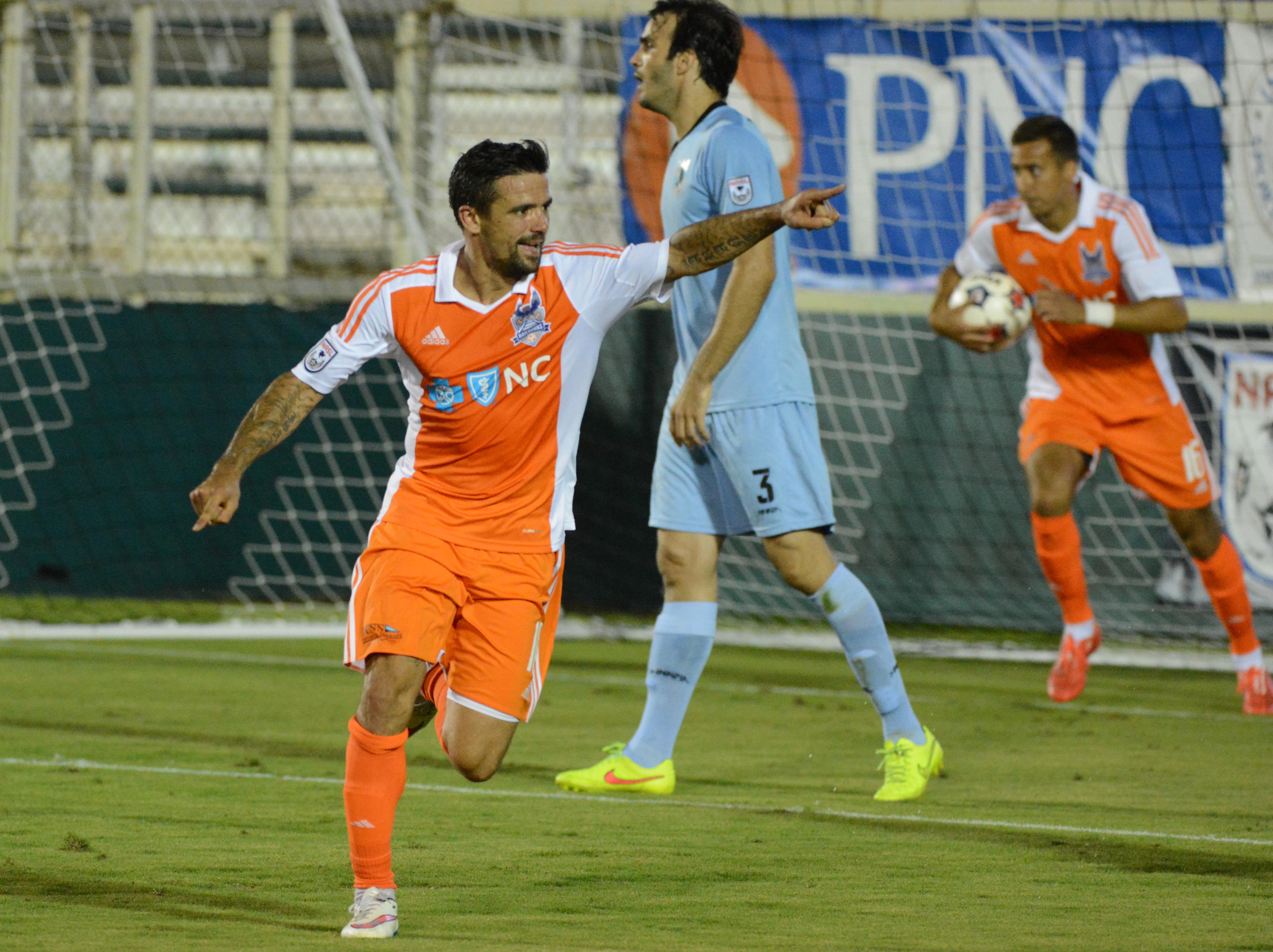 A bit of pinball wizard and Ft. Lauderdale took an early lead. Several consecutive lofted balls outside the box ended with James Marcelin putting a contested header at the feet of Pinho, who chipped a rushing Hildebrandt for the goal. Marcelin was lucky to put the ball where he did: it bounced off the back of his head and he could only have been trying to keep the play alive. Centerbacks Cristiano Dias and Tiago Calvano were caught ball watching a bit and likely should have either been marking players in their area or guarding the posts (either might have saved the goal). Credit Pinho, though, for the clever chip to put his team ahead.