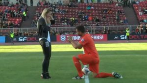 After we finished talking, Brian and his wife Maria Paula went for their pre-game ritual, to say a prayer of thanks on the field. As they left, they introduced me to a lovely young lady named Taylor, Romuald Peiser’s girlfriend. Taylor had met the Deltas’ goalkeeper during his time with the Ottawa Fury and she was enjoying living in San Francisco. She had a special role to play at the game that day, although not quite what she expected. She thought she was taking the honorary opening kick of the game. It turned out to be much more special than that. After she came out onto the field, Peiser said a few words to Taylor. Then he dropped to one knee, proposing to her in front of the whole Deltas community (of course she said yes).