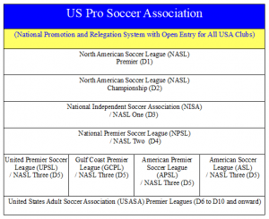 The new association will recognize the historical NASL as the national D1 and D2 of its own association, NISA as the national D3, NPSL as the national D4, and all other associations as the regional D5s and D6s of its association, where leagues connect through promotion and relegation and clubs eventually enter the divisions based on merit of play like around the world.
