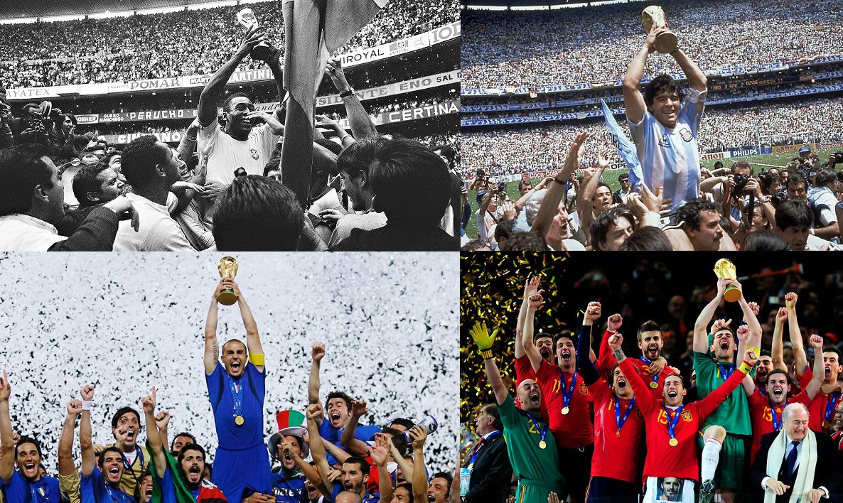 Collage of Brazil, Argentina, Italy, and Spain winning the FIFA World Cup in 1970, 1986, 2006, and 2010 respectively. Photos courtesy of the AP & AFP.